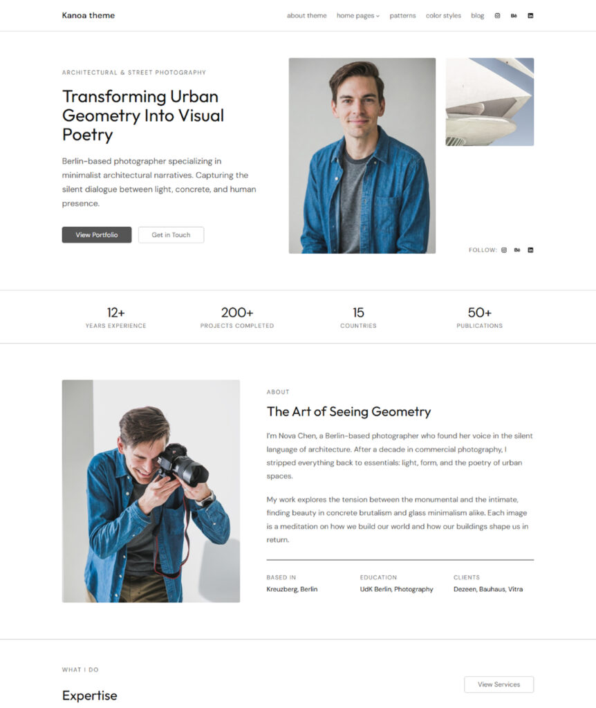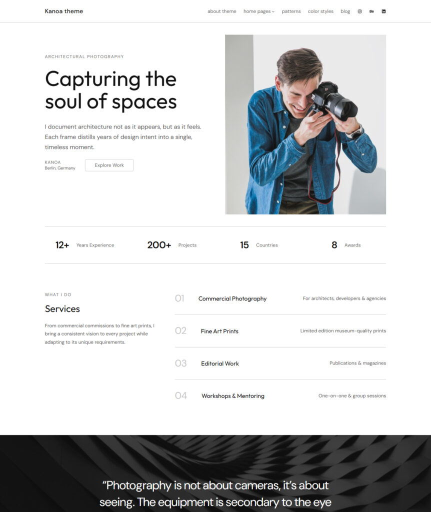 Built for people who create. Whether you’re a photographer, designer, writer, or architect — Kanoa gives your work the spotlight it deserves with thoughtful, distraction-free design.